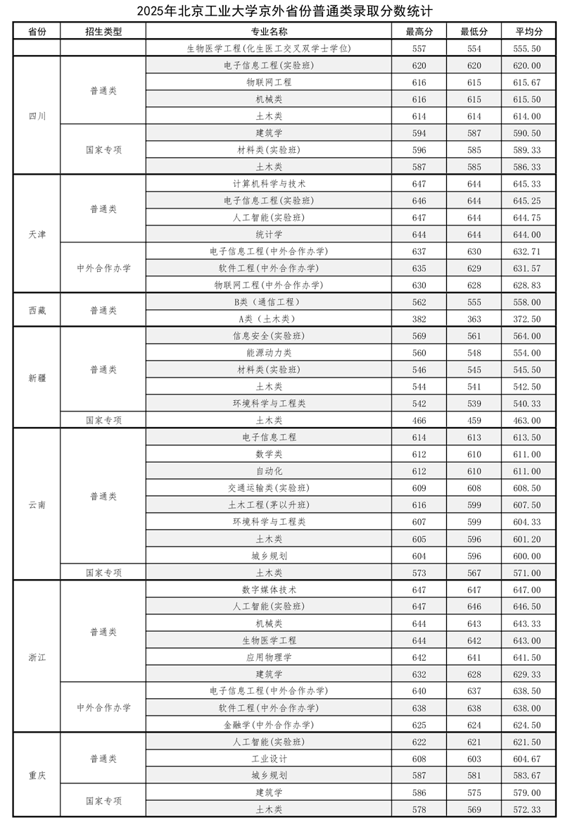 | 2025年北京工业大学京外省份普通类录取分数统计 | |||||||