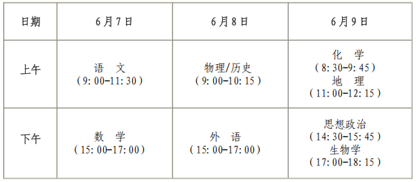 (十五)我省统一高考于6月7日开始举行,具体科目考试时间安排如下: