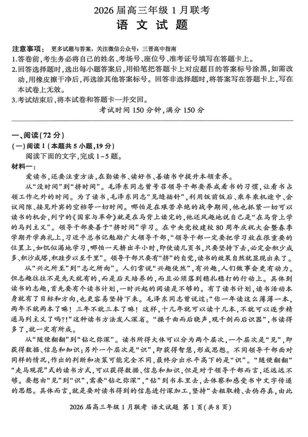 百师联盟暨九省联考2026年1月高三上学期期末考试语文试题及参考答案来啦,一起来看!