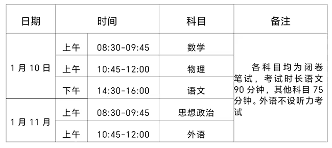2025年冬季合格考开考5个科目,分别是语文、数学、外语、思想政治、物理,各科目均为闭卷笔试,考试时长语文90分钟,其他科目75分钟,外语不设听力考试。具体时间详见下表: