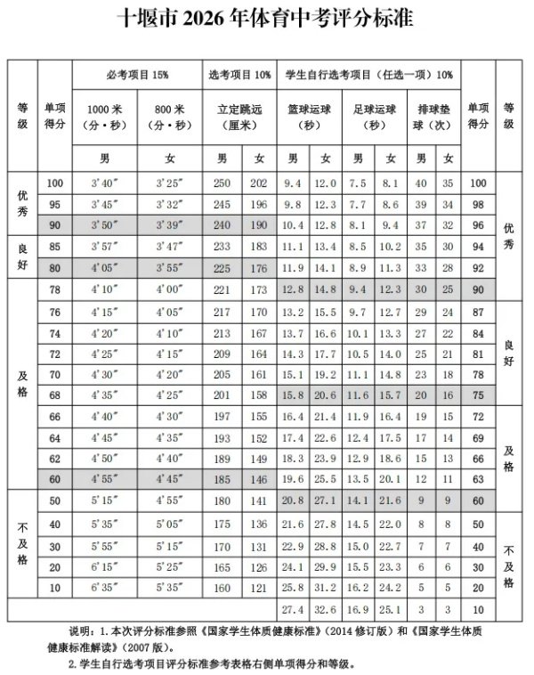 根据《十堰市2026年初中学业水平体育与健康考试工作实施方案》,今年考试仍由平时考核成绩和现场测试成绩两部分组成,满分50分计入中考总分。其中平时考核占15分(每学年5分),现场测试成绩占35分,包括必考项目、选考项目和学生自行选考项目。必考项目为男生1000米跑、女生800米跑(15分);选考项目为立定跳远(10分);自行选考项目包括篮球运球、足球运球、排球垫球三项,考生可任选其一(10分)。