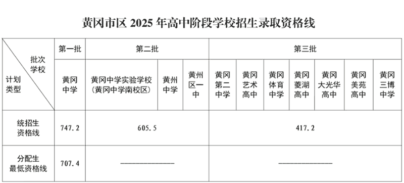 | 县市区 | 第一批(黄冈中学) | 第二批(统招生) | 第二批(分配生) | 第三批(普通高中/中职) |
