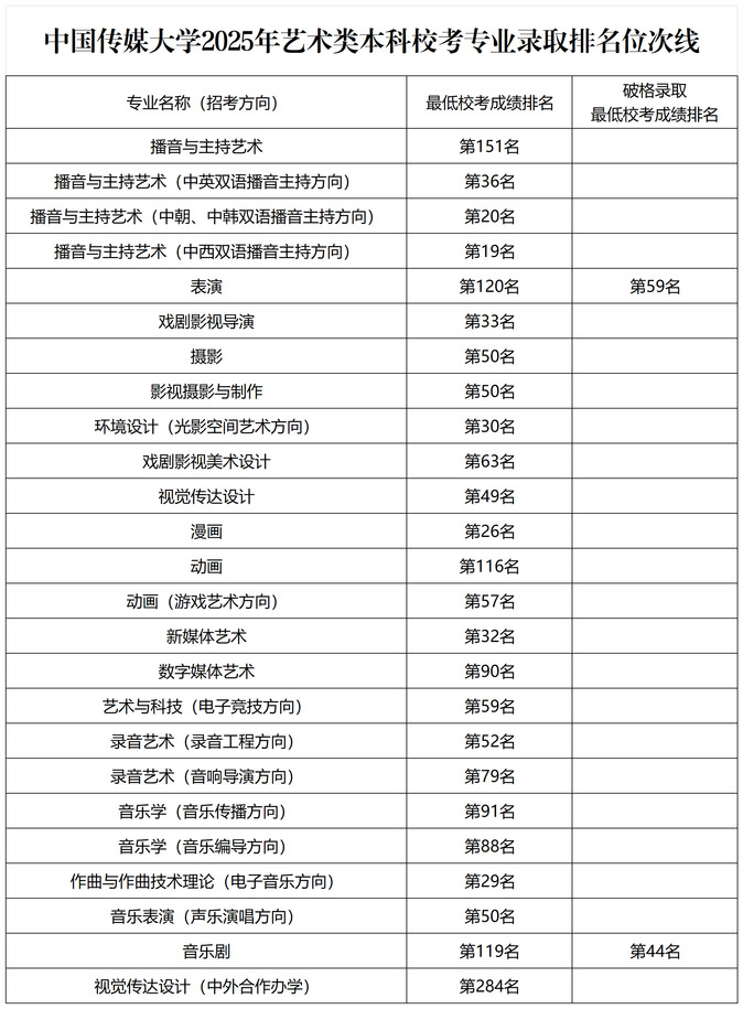 中国传媒大学2025年艺术类校考专业录取情况公布 2025-07-12 22:42:22 中国传媒大学2025年艺术类本科校考专业录取排名位次线公布,以下是详细情况: 特别说明:表演、音乐剧专业破格录取名单通过我校艺术类校考报名系统在专业合格生源范围内公示。 标签: 艺术院校
